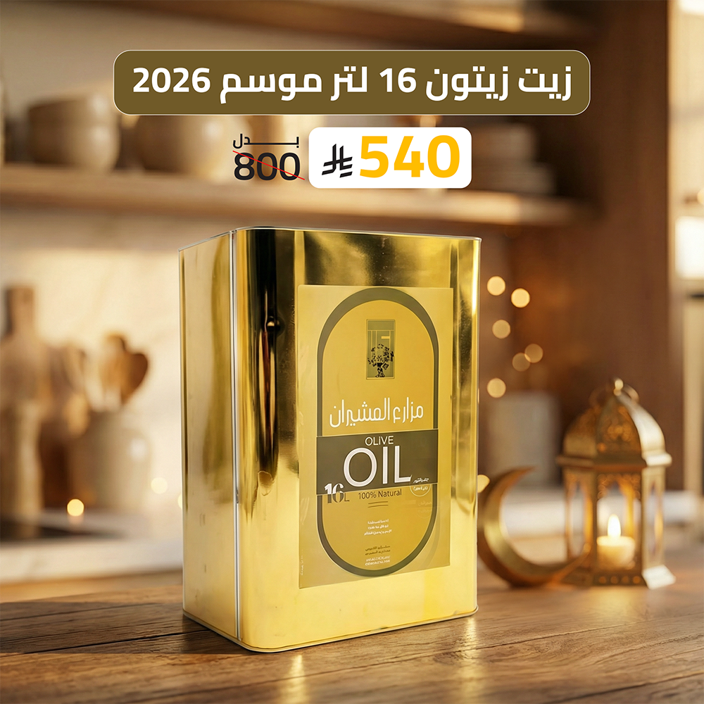 نحتفل معكم في مزارع العشيران ببداية موسم الخير، موسم حصاد "الذهب الأخضر"، ونضع بين أيديكم عرض زيت الزيتون 16 لتر من إنتاج موسم 1447 هـ (2026 م). يأتيكم هذا المنتج الفاخر مباشرة من أراضي سكاكا الجوف المباركة، حيث العناية الفائقة بأشجار الزيتون وطرق العصر الحديثة. نحن نقدم لكم زيتاً بكراً عصره أولى على البارد، يجمع بين النكهة الأصيلة والفوائد الصحية العظيمة، ليكون رفيق مائدتكم الدائم. ولأننا نقدر عملاءنا، نقدم لكم فرصة ذهبية لاقتناء هذا المنتج